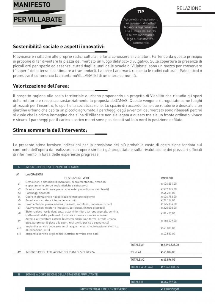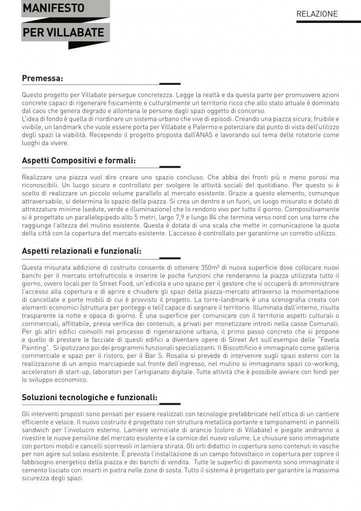 Tra le 22 proposte progettuali pervenute per il Comune di Villabate, la Giuria ha assegnato il primo premio a 404DESIGN, team multidisciplinare che ha presentato un progetto basato sulla realizzazione di un forte landmark territoriale, una torre, e sulla rifunzionalizzazione delle rotatorie nell’ambito della viabilità urbana.