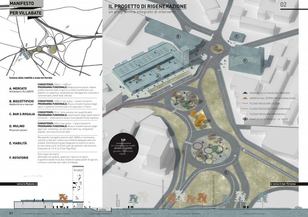I parcheggi degli avventori del mercato saranno ribassati, così da dare una prima immagine di Villabate come un posto caratterizzato da un fronte vivace, ordinato e sicuro.