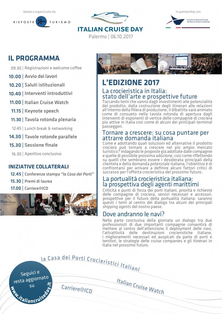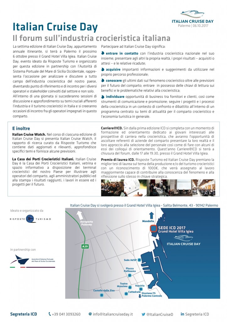 E’ stata presentata a Palermo la settima edizione dell’Italian Cruise Day, il forum annuale di riferimento in Italia per il comparto crocieristico ideato e organizzato da Risposte Turismo – società di ricerca e consulenza a servizio della macroindustria turistica – quest’anno in partnership con l’Autorità di Sistema Portuale del Mare di Sicilia Occidentale e con il supporto di CLIA Europe, in programma venerdì 6 ottobre a Palermo presso il Grand Hotel Villa Igiea.