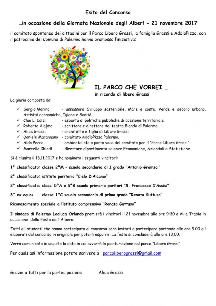 Martedì 21 novembre per la festa dell’albero a Villa Trabia, dalle ore 10 saranno premiati i ragazzi che hanno partecipato al concorso sul Parco Libero Grassi. Attraverso un’adesione entusiasta e partecipazione hanno immaginato servizi e attività che un Parco deve avere. Hanno fatto vivere la loro fantasia, mostrando quanta bellezza può liberarsi attraverso il sogno e la passione.