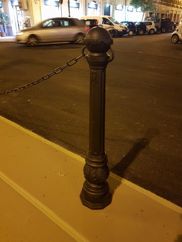 Il marciapiede antistante l’ingresso dell’Hotel è stato rifatto in cemento con una superficie ruvida, è suddiviso in quadrati e le fughe danno un effetto come se fossero stati installati dei mattoni. Mentre la parte centrale delimitata dai paletti in ghisa è costituita da un asfalto stampato. Questa tecnica consente di colorarlo e mantenere il colore molto più a lungo. Il colore che è stato dato all’asfalto è lo stesso della facciata dell’Hotel.