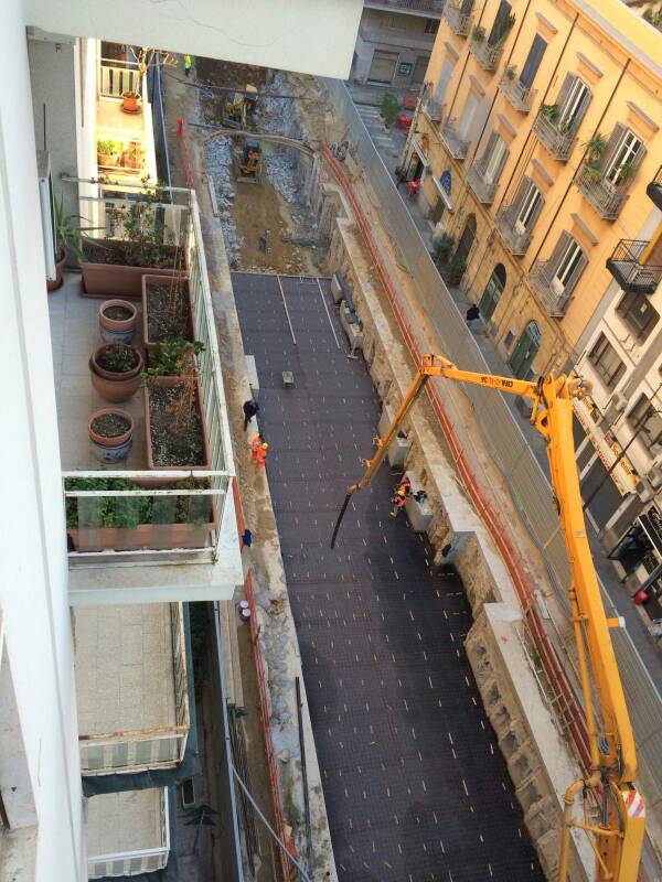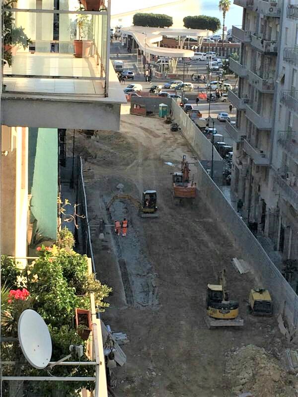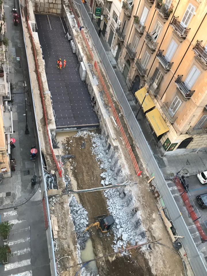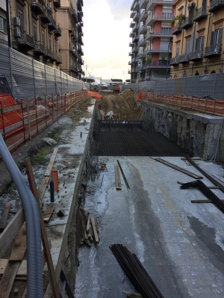 Nelle prime settimane di questo 2018 i lavori dell’anello ferroviario hanno incrementato il ritmo e giudicando anche dalle foto possiamo notare come in pochi giorni sia stato realizzando il solettone del secondo tratto di Via Amari verso il porto, impermeabilizzato e riempito con terreno che sarà adesso costipato.