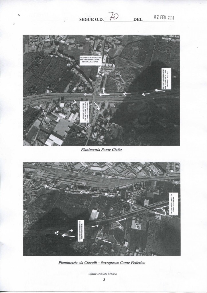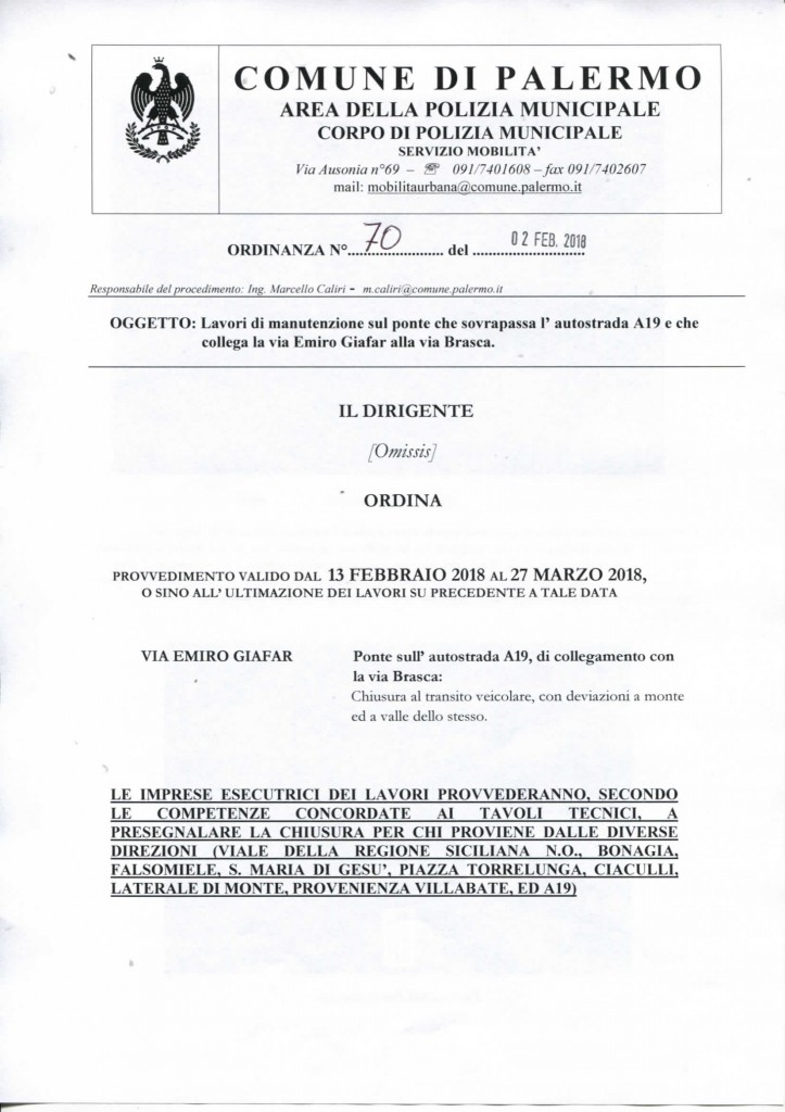Premesso che l’area tecnica della riqualificazione urbana e delle infrastrutture ha rappresentato delle criticità presenti sul ponte che collega via Emiro Giafar alla via Brasca, sull’autostrada A19 in direzione Catania / Messina, si ritiene necessaria la chiusura al transito veicolare con deviazioni a valle e a monte dello stesso dal 13 Febbraio al 27 Marzo 2018.