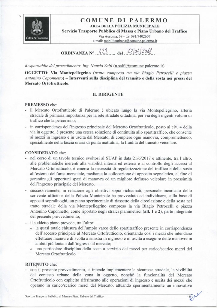 Il Dirigente del Servizio Trasporto Pubblico di Massa e Piano Urbano del Traffico ha emanato ieri un’ordinanza con la quale si dispongono interventi sulla disciplina del transito e della sosta nei pressi del Mercato Ortofrutticolo.