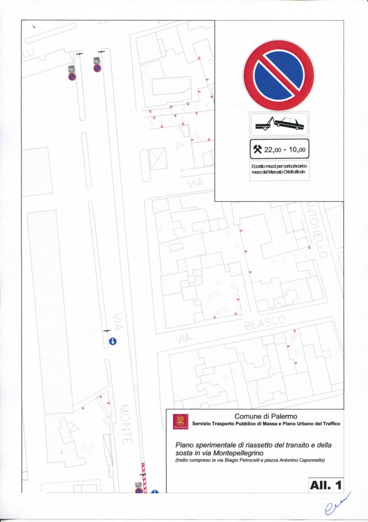 Il Piano sperimentale di riassetto del transito e della sosta in via Montepellegrino – “arteria stradale di primaria importanza per la rete stradale cittadina per via degli ingenti volumi di traffico cittadino” – prevede tra l’altro, “la quasi totale chiusura dell’ampio varco dello spartitraffico, presente in corrispondenza dell’accesso principale al Mercato Ortofrutticolo, orientando così i mezzi che intendano effettuare manovre di svolta a sinistra in ingresso e in uscita a eseguire dette manovre in ambiti più lontani dall’ingresso al mercato”, nonchè “una particolare disciplina della sosta a servizio dei mezzi per carico/scarico merci del Mercato Ortofrutticolo”.