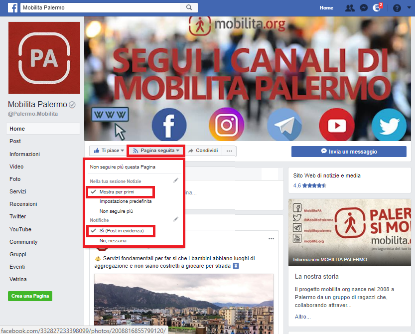 - per seguire la pagina: cliccare su “pagina seguita”, dopo di che si aprirà una finestra e bisogna selezionare le voci, “mostra per primi” e “si (post in evidenza)”;