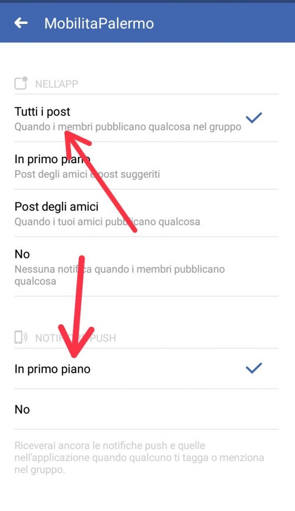 - per seguire il gruppo, basta cliccare sulla freccia, dopo di che cliccare su “modifica impostazioni di notifica”, infine selezionare “tutti i post” e “in primo piano”;