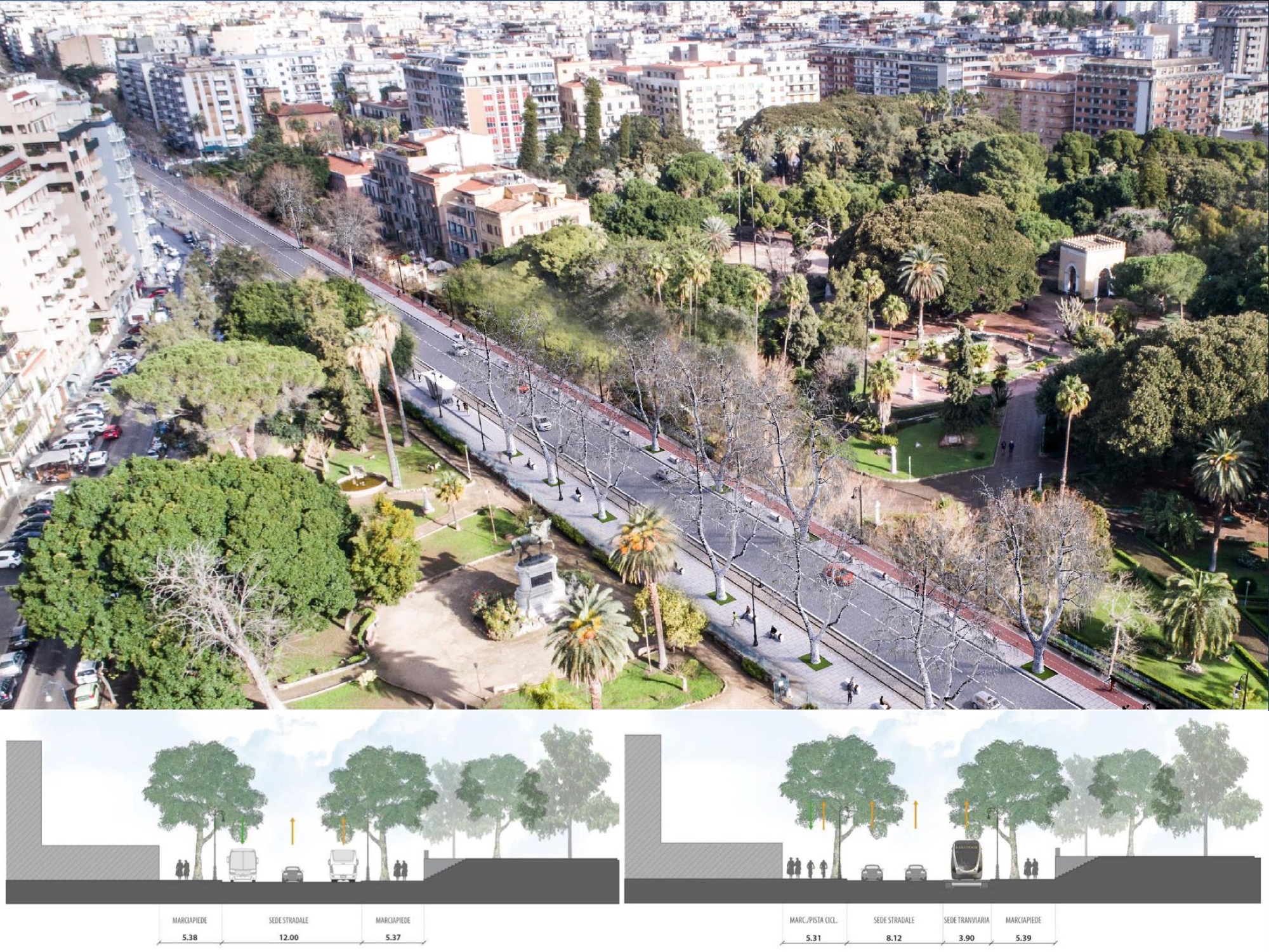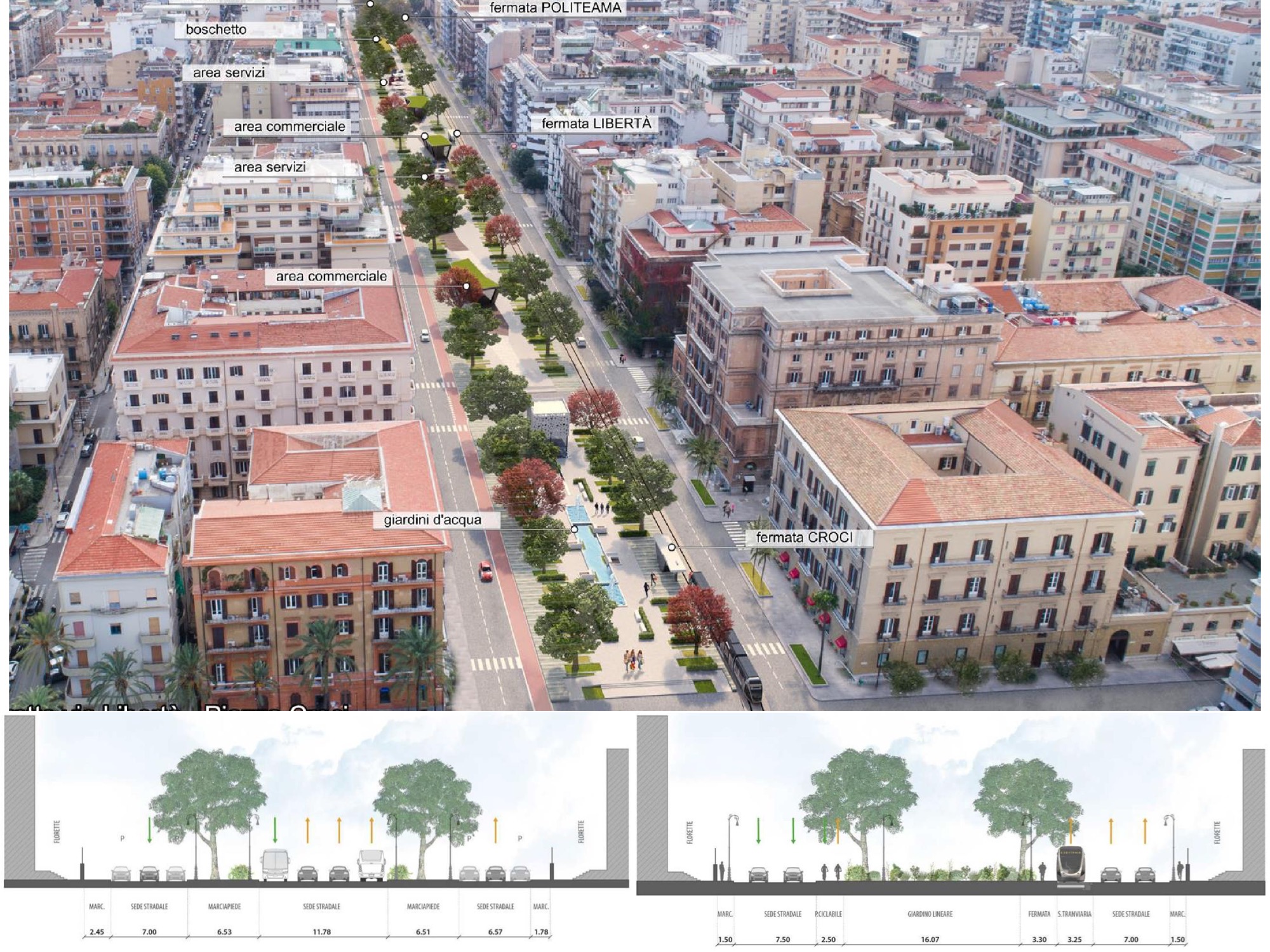 Anzitutto la pedonalizzazione di via Roma, che consentirà la creazione di ampi marciapiedi e di godere di un viale alberato. In secondo luogo vedremo una vera e propria pista ciclabile bidirezionale su via Libertà e finalmente si pedonalizzerà anche via Ruggero Settimo.