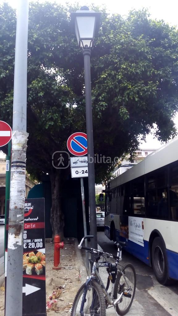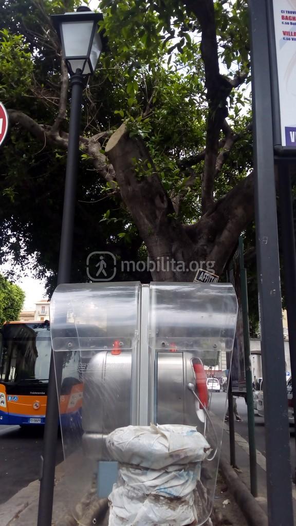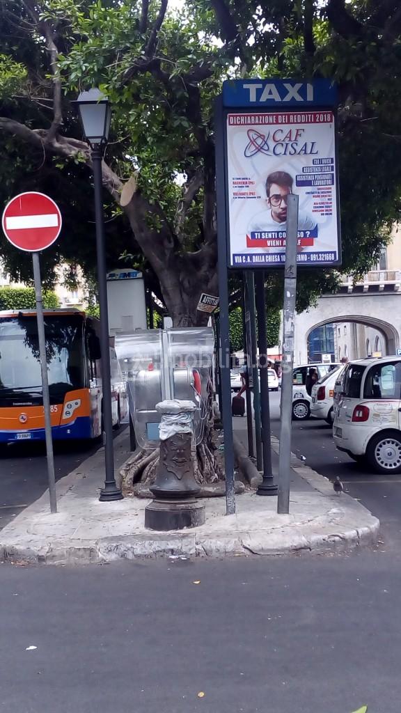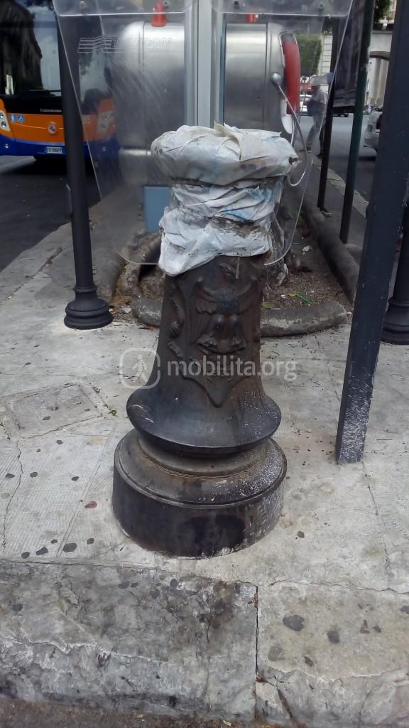 Siamo alla stazione centrale di Palermo, di fronte il capolinea del 101 di Amat. Come potete vedere dalla foto c’è un tronco di palo di vecchio stile, simile a quelli installati nella nuova area pedonale antistante la stazione centrale. Il tronco di palo è conservato bene, chiuso da una plastica, ben curato direi! Prima era diventato un punto di raccolta di spazzatura.