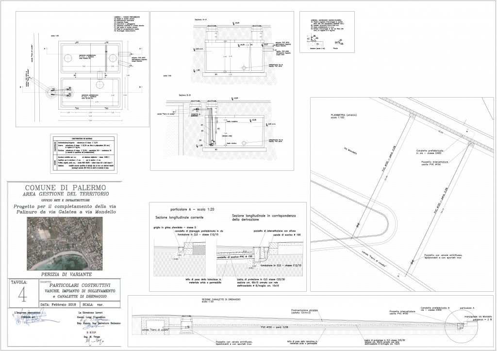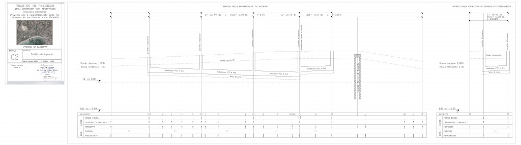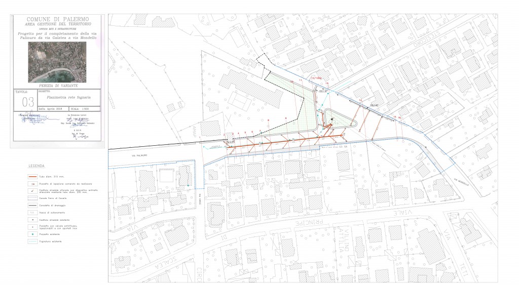 Nell’ambito dei lavori, rimossi i cumuli di terreno presenti sul canale, è stato possibile rilevare l’esatta conformazione geometrica-strutturale del canale e, eseguiti due pozzi d’ispezione in posizione adiacenti ed opposti al canale stesso, effettuato sopralluogo congiunto con i tecnici dell’AMAP (cui sarà affidata la pulizia e gestione del Ferro di Cavallo) e considerata, infine, la diversa modalità di recapito delle acque meteoriche, è emersa la necessità di aumentare di 20 cm. la quota finita della strada in corrispondenza al canale. Detta, seppur lieve, modifica di quota ha portato al cambiamento dell’ultimo ramo del canale centrale della fognatura (dalla Sez. 12 in poi) ed allo spostamento delle griglie a raso previste in via Mondello onde avere una migliore intercettazione delle acque superf iciali non assorbite dalla rete fognaria esistente.