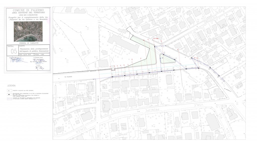 Infine, considerato che sono stati consegnati i “Lavori di rinnovamento e ristrutturazione degli impianti di Pubblica Illuminazione del quartiere Mondello-Valdesi’ e che nell’ambito di detti lavori è prevista anche il rifacimento dell’impianto di via Mondello, al fine di evitare raddoppi di lavorazioni ed interventi successivi sulle opere appena realizzate nell’ambito del presente appalto, si è concordata con il R.U.P. e con la D.L. del suddetto lavoro di realizzare, all’interno del presente appalto, la predisposizione dell’impianto di pubblica illuminazione (fondazioni dei pali, pozzetti d’ispezione e relativi cavidotti).