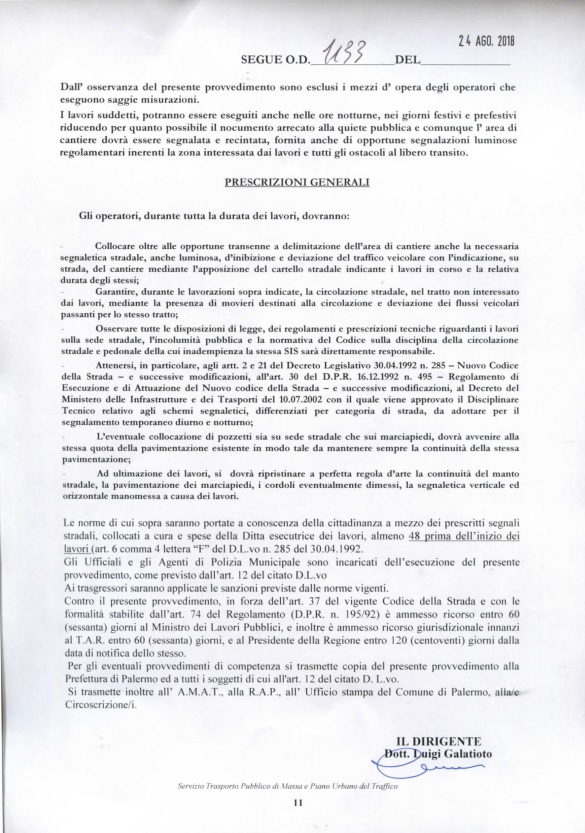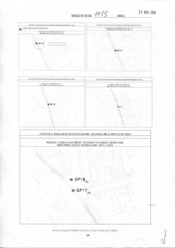 In particolare con l’ordinanza 1133/2018 è stata determinata la validità del provvedimento nel periodo compreso dal 27 agosto al 9 settembre ed occorrendo dal 17 al 22 settembre, previa  comunicazione 48 ore prima rispetto alle effettive lavorazioni per la esecuzione dei saggi onde  evitare disagi alla circolazione e garantire la percorribilità delle strade interessate.