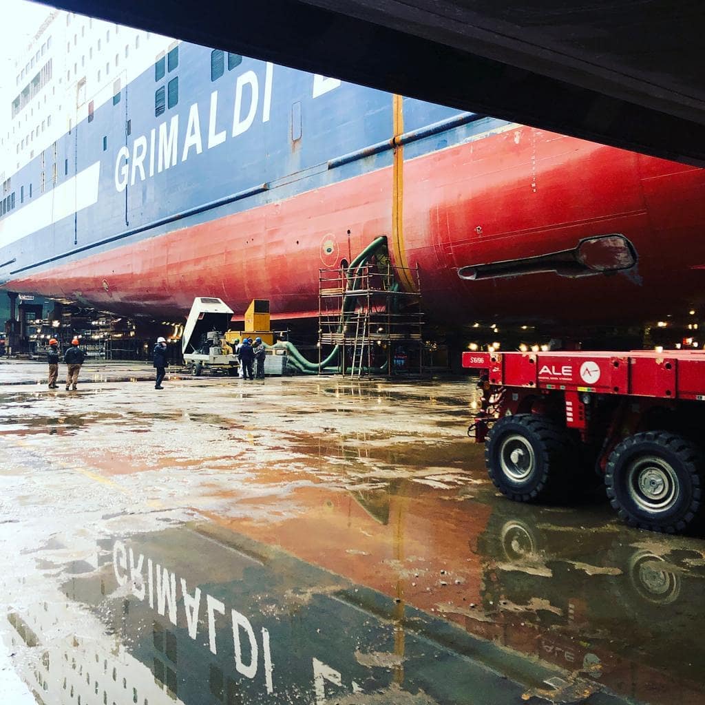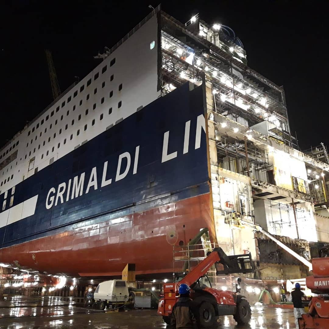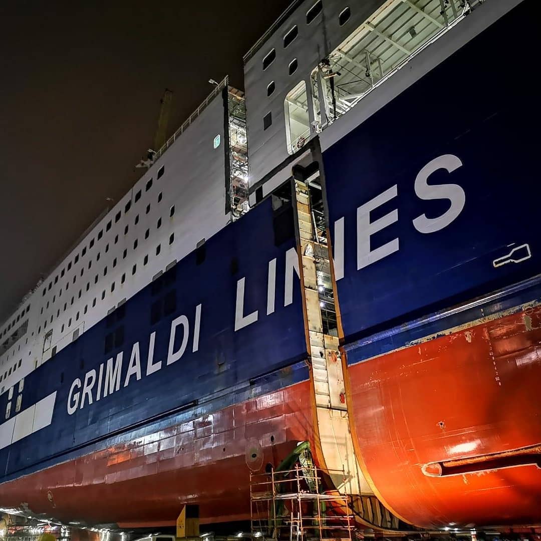 Dopo l’arrivo del traghetto di Grimaldi Lines avvenuto la scorsa settimana, le lavorazioni per allungare lo scafo della nave sono iniziate.