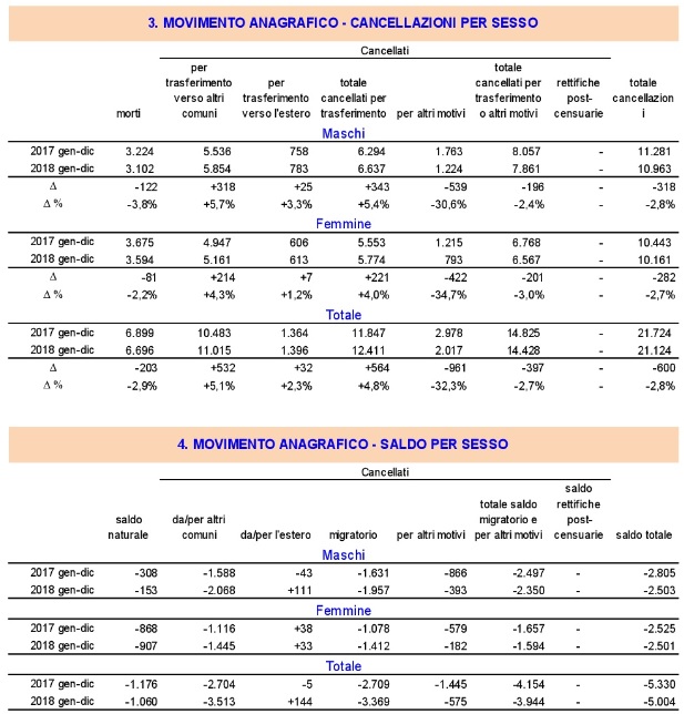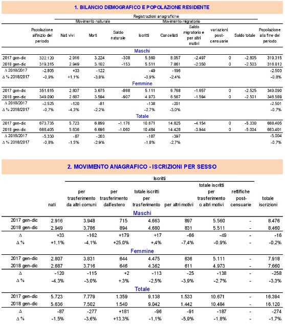 - Il movimento naturale: Con riferimento al movimento naturale della popolazione, nel corso del 2018 si sono registrati 5.636 nati, in diminuzione di 87 unità (-1,5%) rispetto al 2017. Il numero dei nati si conferma pertanto ai minimi degli ultimi 50 anni .
