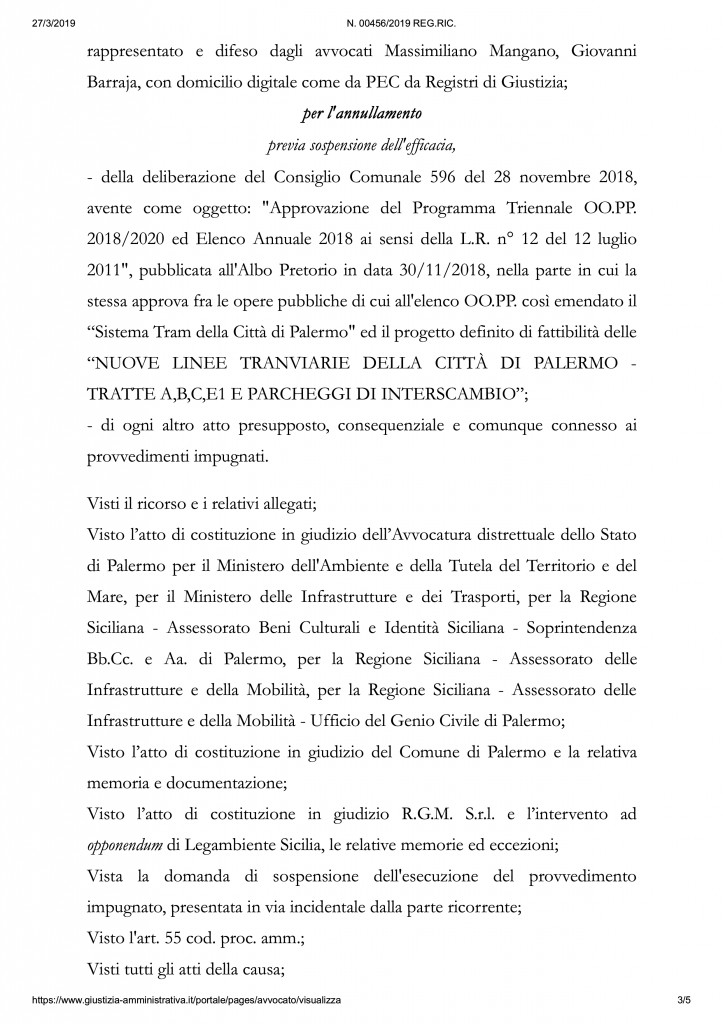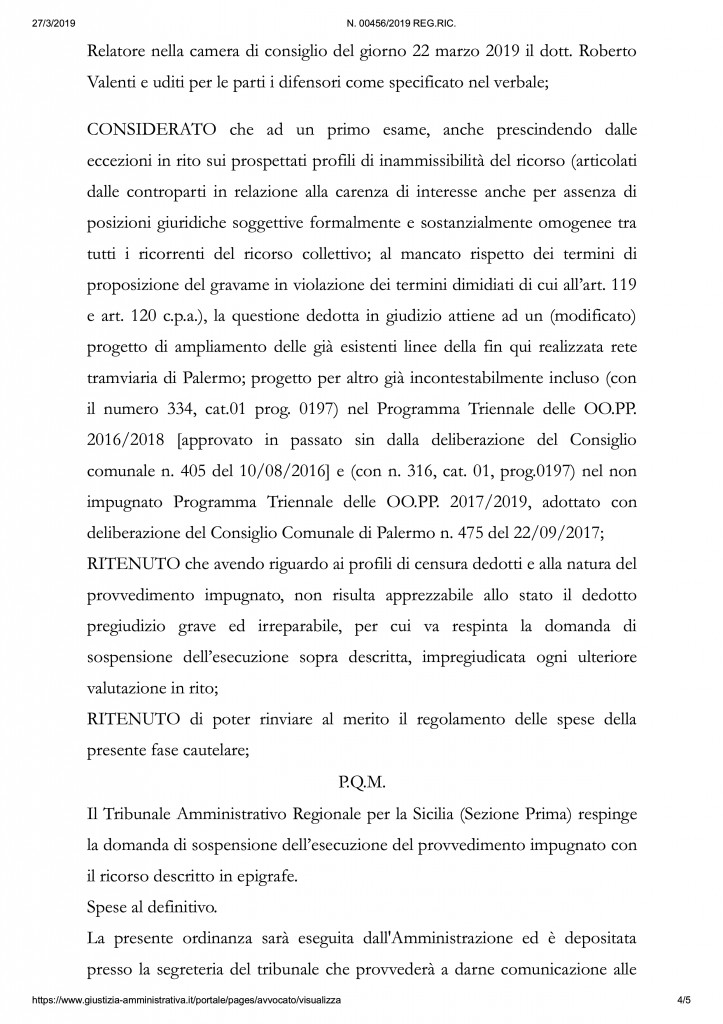 Si tratta più precisamente di un’ordinanza cautelare che, in attesa del processo vero e proprio, non sospende l’efficacia del provvedimento che approva il progetto dei tram perchè non riscontra nè fondate aspettative da parte dei 60 ricorrenti nè un pericolo di danno irreparabile. Il Comune di Palermo può andare avanti nella procedura di realizzazione delle linee tranviarie in attesa del processo e della sentenza.