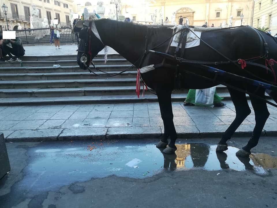 Ape Calessini, venditori ambulanti (che spostano i pochi arredi urbani presenti per parcheggiare) e soprattutto carrozze a cavallo che stazionano in questo lembo di strada trasformandolo letteralmente in una stalla. Eppure nessuno sembra rispettare gli spazi assegnati, nessuno che osa richiamarli. I cavalli ovviamente liberi di urinare, ma basta una secchiata d’acqua (?).