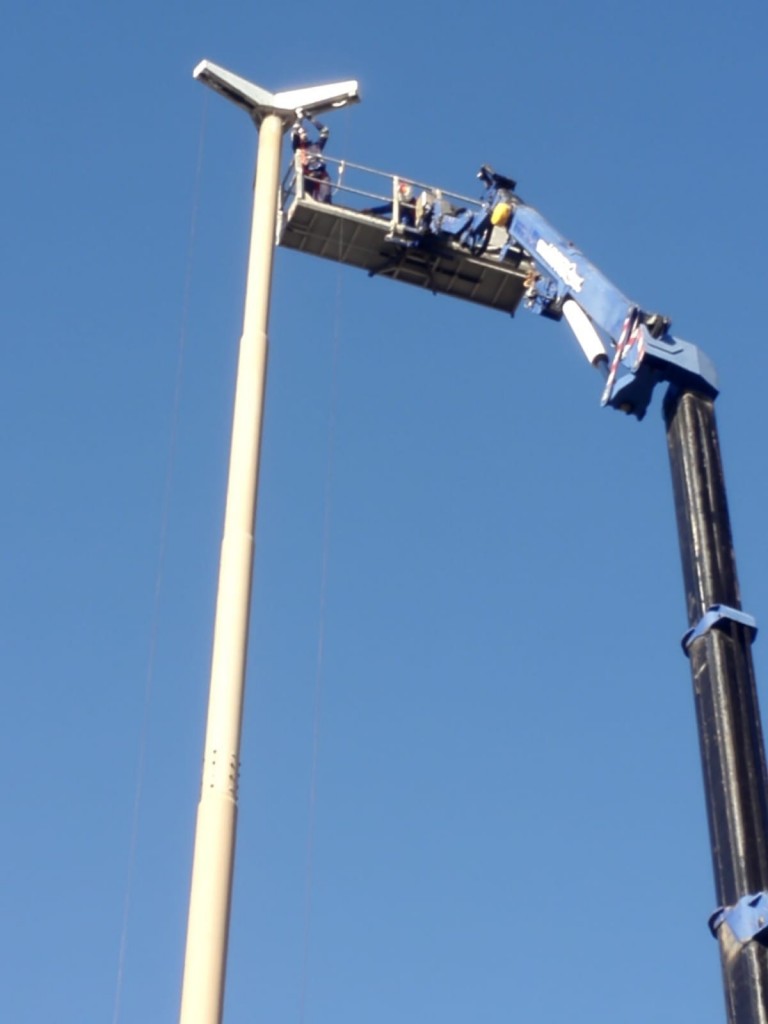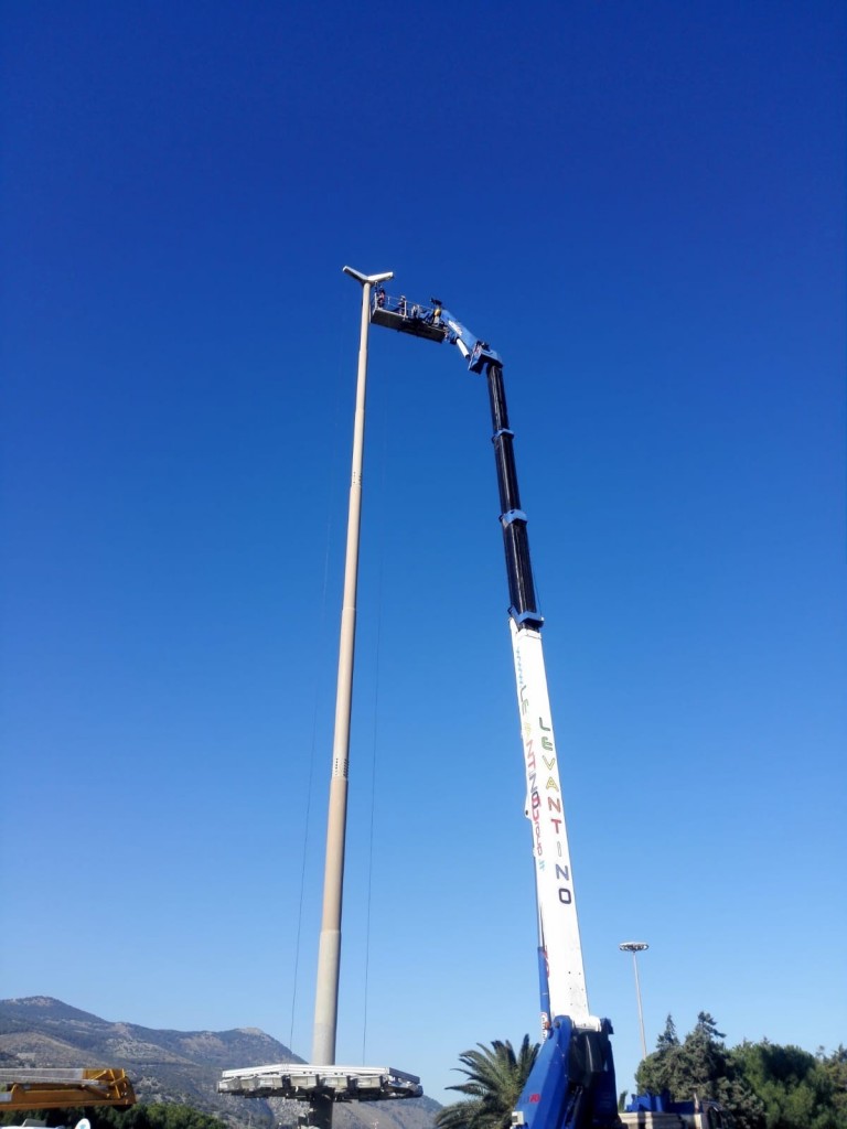 Tornano in funzione le tre torri faro dello svincolo di via Belgio. E’ stato completato dagli operatori di AMG Energia un intervento lungo e complesso, eseguito con una speciale piattaforma elevatrice capace di raggiungere i 70 metri di altezza. Per effettuare l’intervento di manutenzione ordinaria sulle corone dei tre impianti dello svincolo, infatti, è stato necessario noleggiare un mezzo con caratteristiche di altezza di gran lunga superiori a quella dei veicoli in dotazione alla società e attenderne la disponibilità. Per la conformazione degli svincoli, infatti, il mezzo può posizionarsi soltanto in alcune zone della strada e la sommità delle corone delle torri faro può essere raggiunta solo da una piattaforma elevatrice capace di raggiungere i 70 metri.