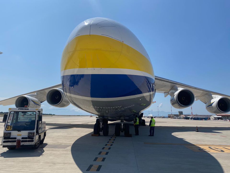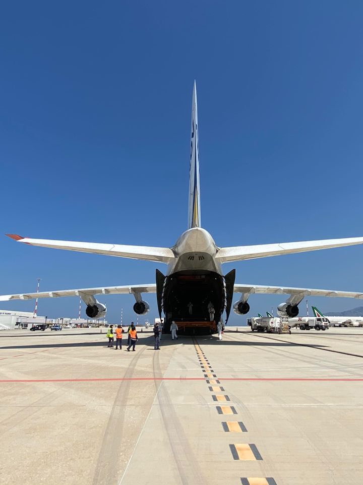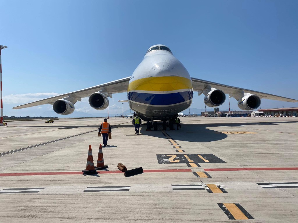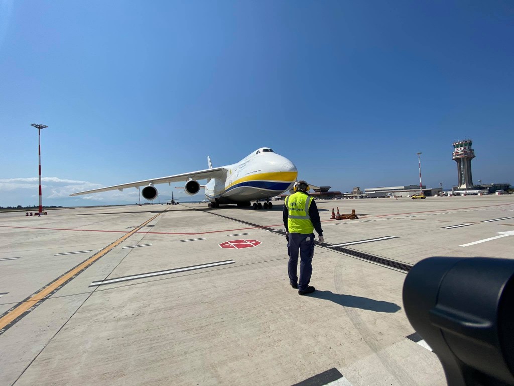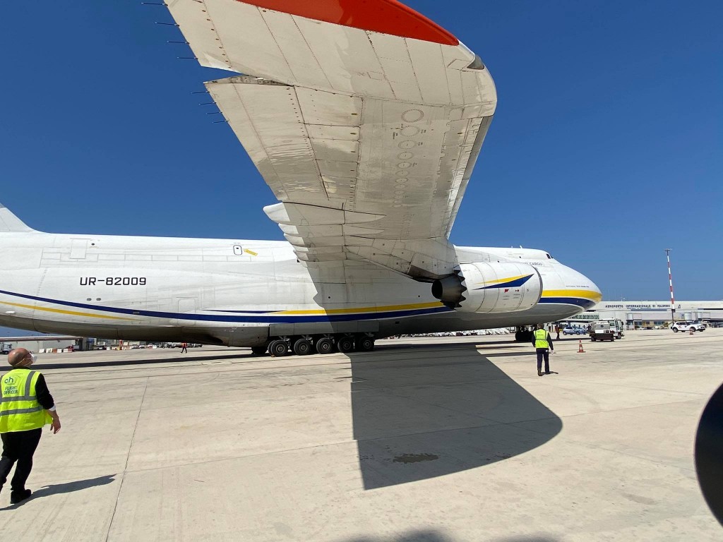 L’Antonov 124-100M-150 della Antonov Company è un gigante dell’aria lungo 69,10 metri e alto 21,10, con 73,30 metri di apertura alare. E’ arrivato da Bucarest.
