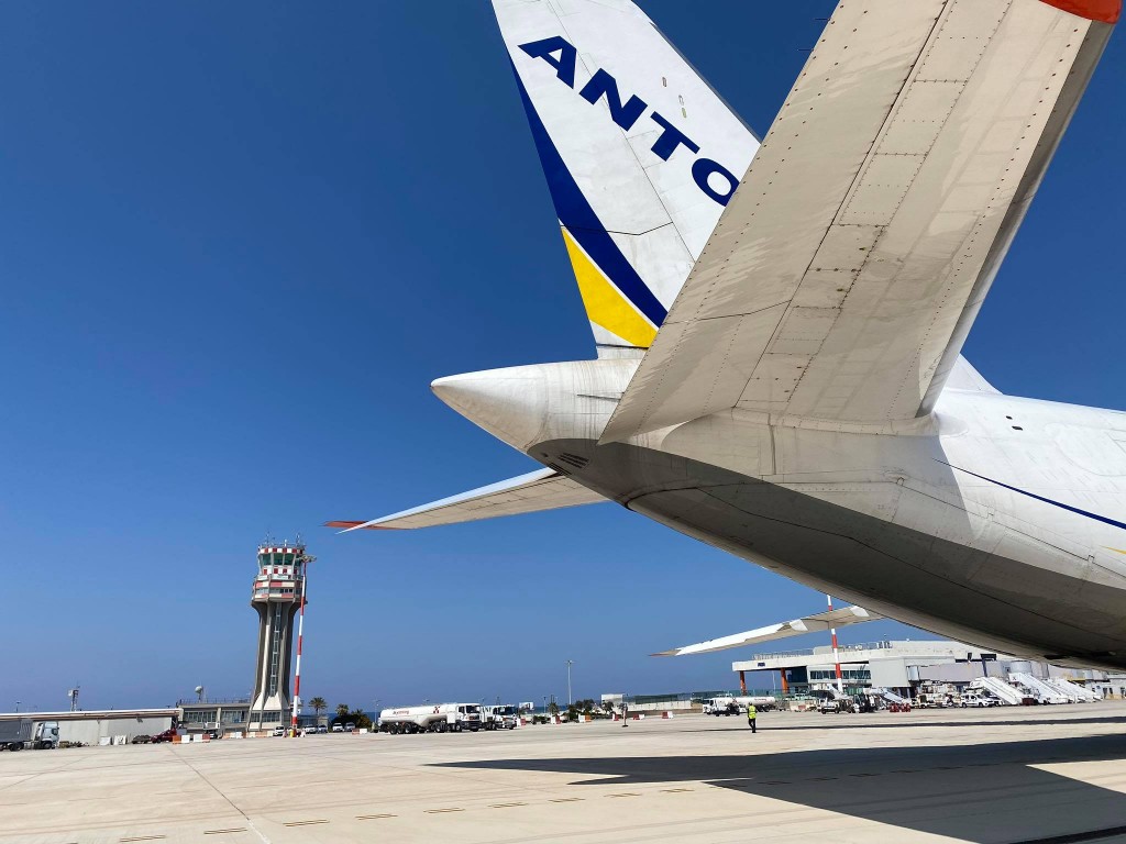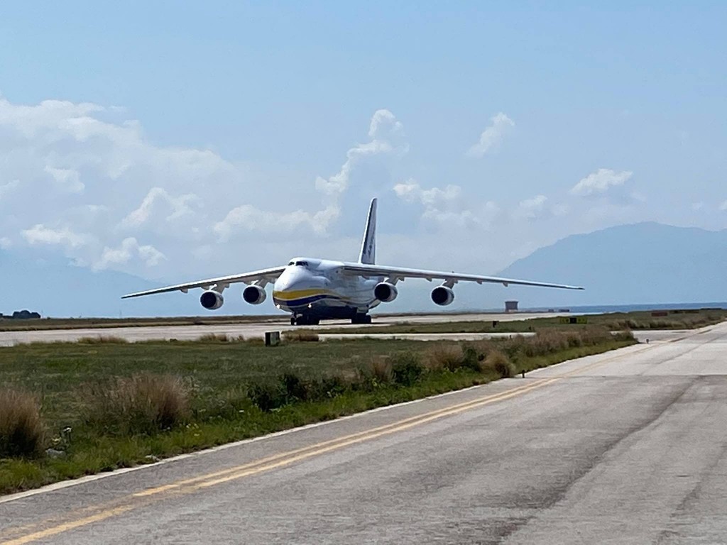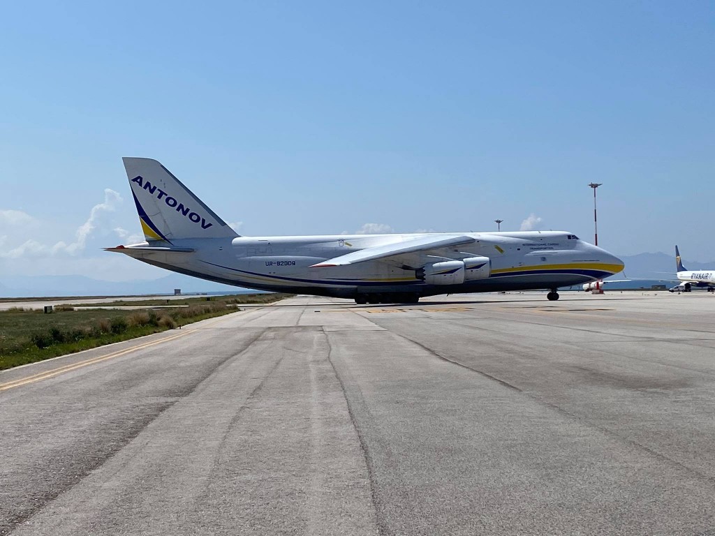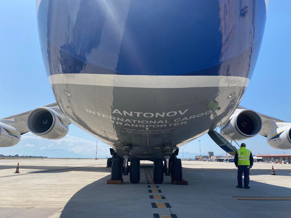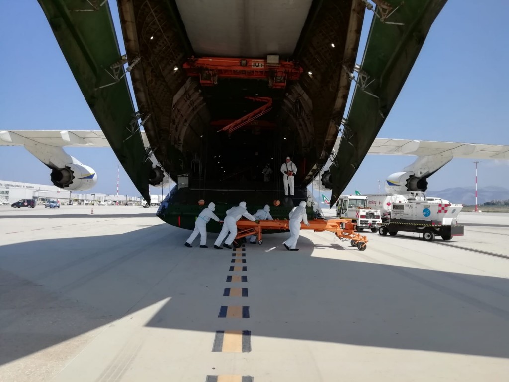 L’Antonov 124-100M-150 della Antonov Company è un gigante dell’aria lungo 69,10 metri e alto 21,10, con 73,30 metri di apertura alare. E’ arrivato da Bucarest.