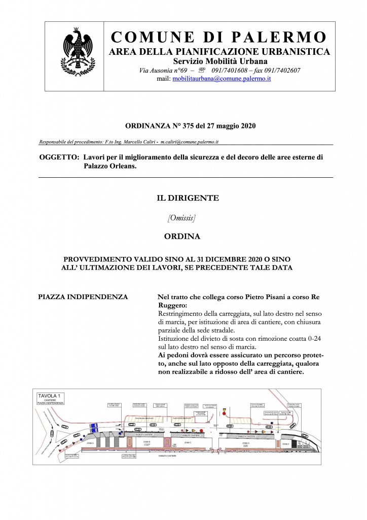 Riassumendo : il Comune ha deciso di chiudere parte di Piazza Indipendenza per “lavori per il miglioramento della sicurezza e del decoro delle aree esterne di Palazzo Orleans” non meglio precisati .