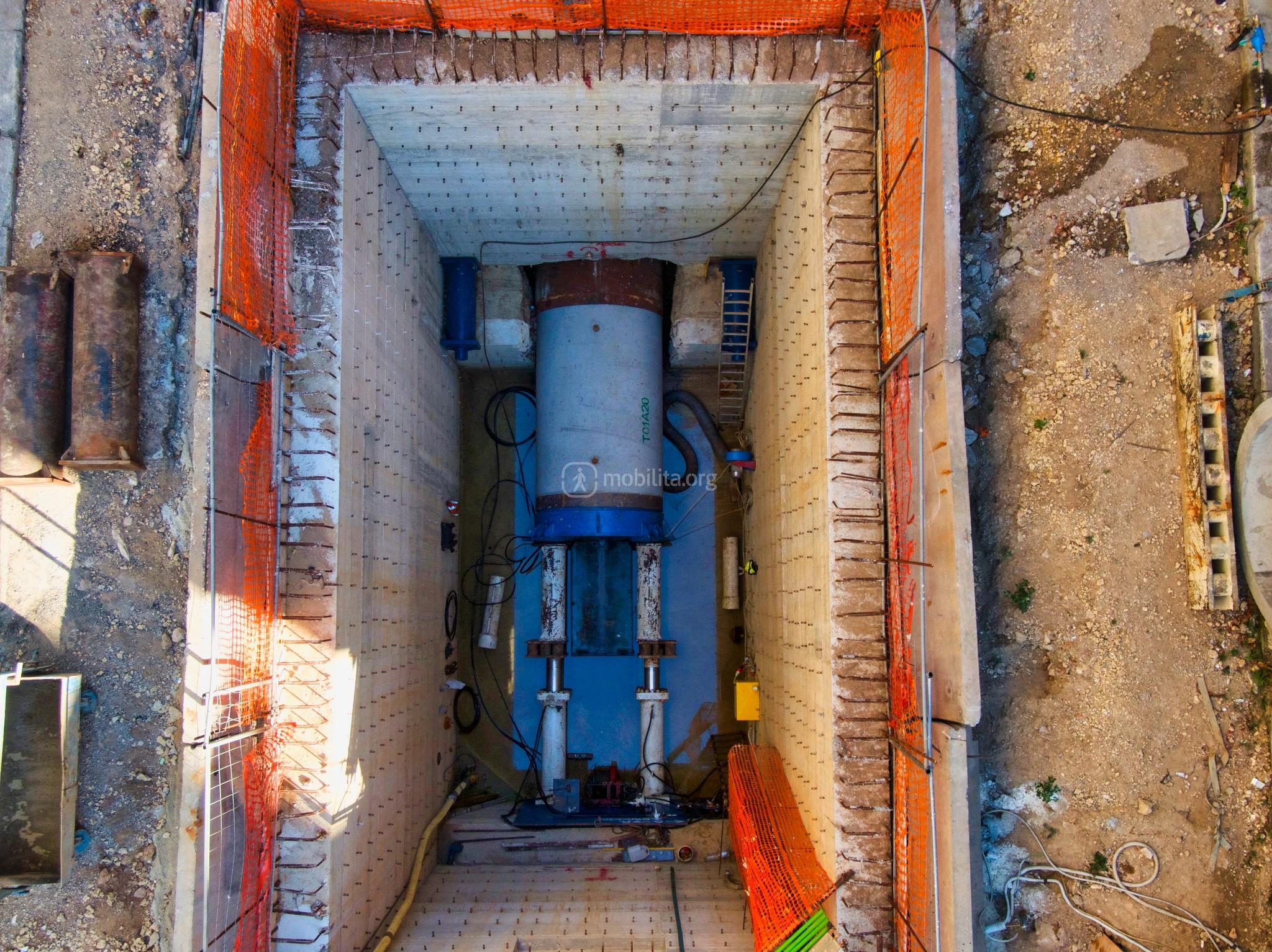 L’attrezzatura di spinta che viene collocata nel relativo “pozzo di spinta” agisce sui tubi lunghi 3,00 metri (diametro 1.600 mm) che sono via via calati all’interno del pozzo.