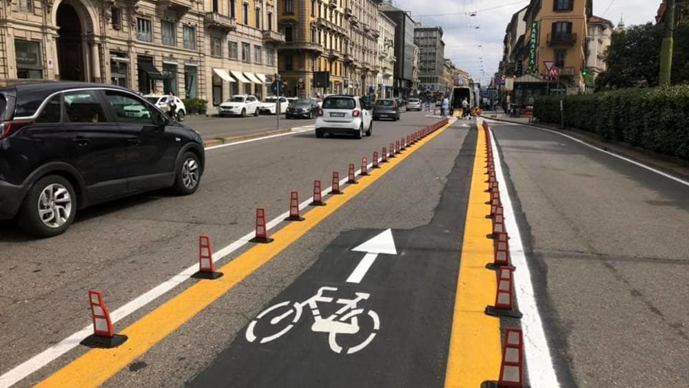 O come qui  in corso Buenos Aires a Milano, la ciclabile realizzata durante l’estate e protetta semplicemente spostando la sosta più all’esterno. Segno che alle volte non servono grandi infrastrutture ma strategia.