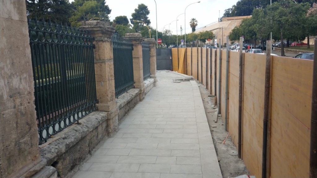 Come visibile dalla foto è stato ormai quasi completato, il restauro dell’intera recinzione in pietra calcarea e ferro battuto che si trova ai bordi di corso Re Ruggero.