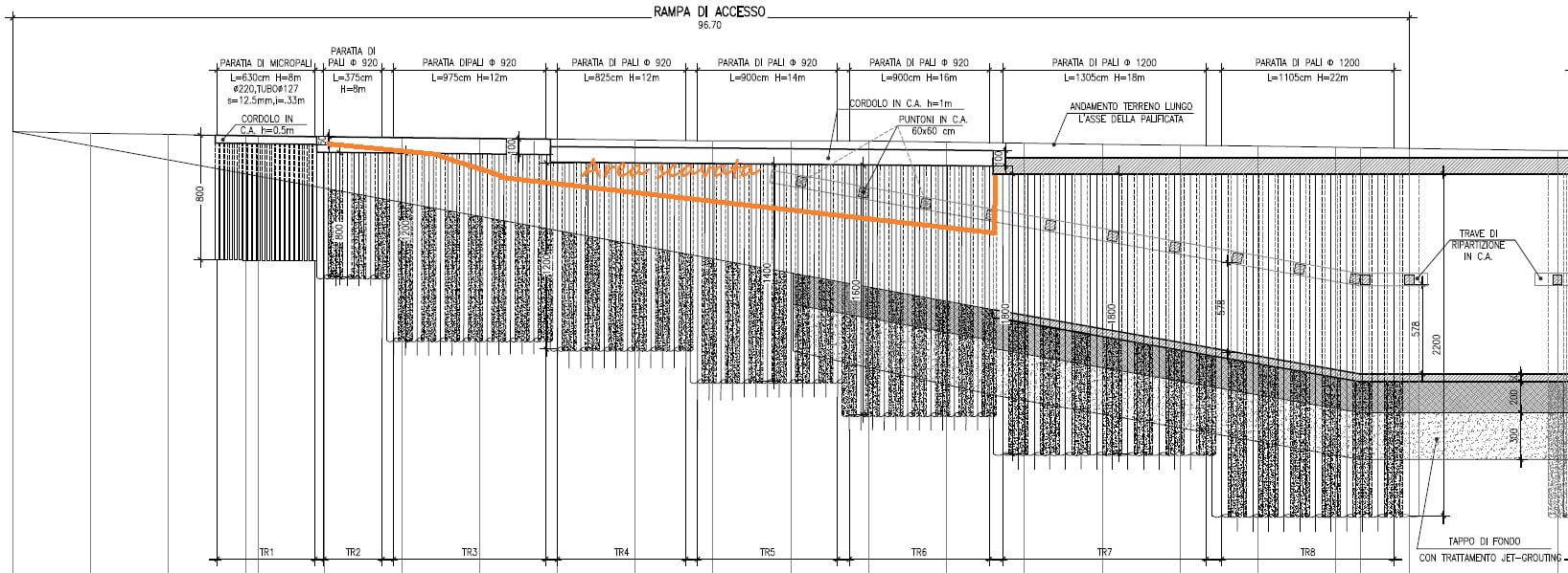 I lavori al momento procederanno con lo sbancamento dei terreni, poi vi sarà un rallentamento temporaneo degli scavi dovuto alla realizzazione dei puntoni per permettere la messa in opera della trave di ripartizione che permetterà di stabilizzare la discenderia.