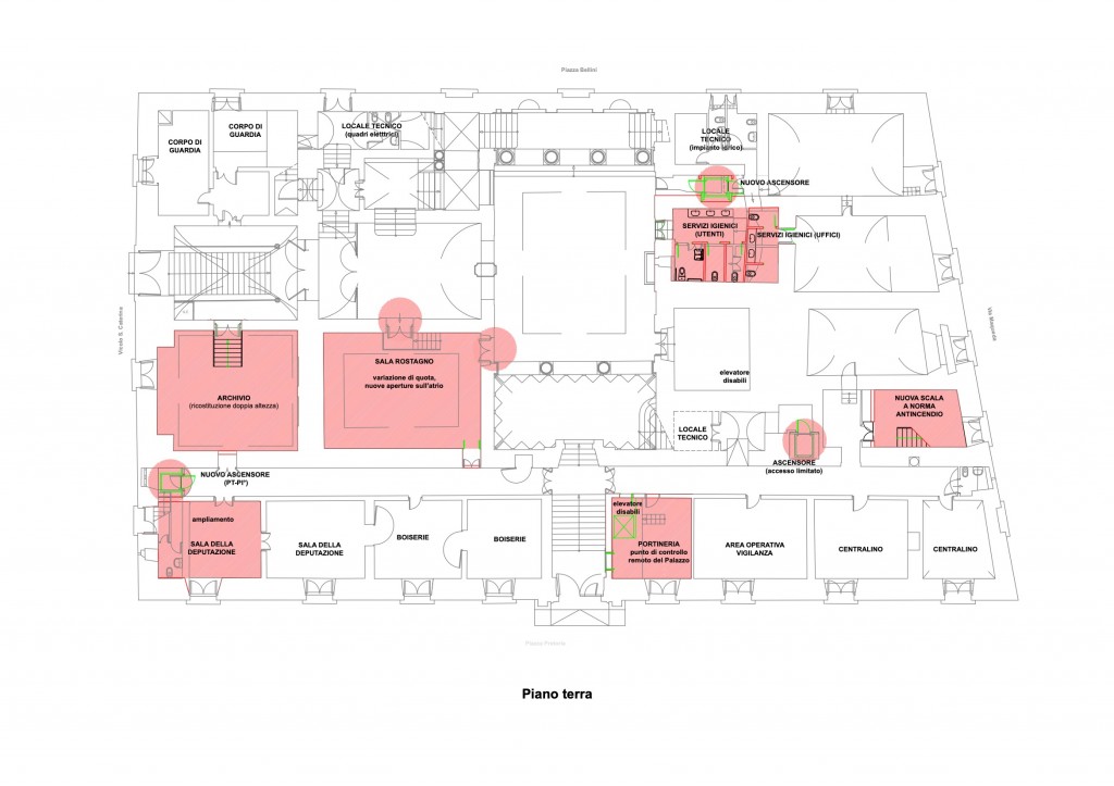 Nelle tavole allegate (PdA – Highlights da P1 a P5 sul rilievo e sul progetto) sono posti in evidenza, per ogni piano, i punti principali in cui si interverrà: inserimento di una nuova scala per tutta l’altezza dell’edificio (lato Maqueda), prolungamento di una rampa della scala esistente lato Bellini, inserimento di ascensori, demolizioni di superfetazioni incongrue (sopraelevazione su vicolo S. Caterina), restauro dell’apparato decorativo, completo rifacimento a norma degli impianti elettrico, idrico, antincendio, di climatizzazione e rete dati, restauro e/o sostituzione degli infissi interni ed esterni con la sostituzione di tutti i vetri con vetri di sicurezza, riconfigurazione delle coperture, rimozione degli scranni in Sala delle Lapidi e messa in luce della pavimentazione a marmi mischi, realizzazione di riserva idrica antincendio, risanamento e recupero del rifugio antiaereo con l’eventuale riapertura degli accessi dalla scalinata di Piazza Pretoria (lato Maqueda), risanamento dell’umidità di risalita nelle murature, demolizione di solai, restauro del lucernario e sostituzione delle specchiature con vetri di sicurezza.