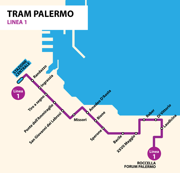 La linea 1 è quella che collegherà il quartiere di Brancaccio alla Stazione Centrale, con un’estensione pari a circa 5,6 km. Le zone interessate sono: Roccella, via Pecori Girali, via Pugliesi, via Amedeo d’Aosta, Corso dei Mille, via Balsamo fino alla Stazione Centrale. La frequenza dei veicoli sarà circa una ogni 5 minuti, con 9 mezzi utilizzati.